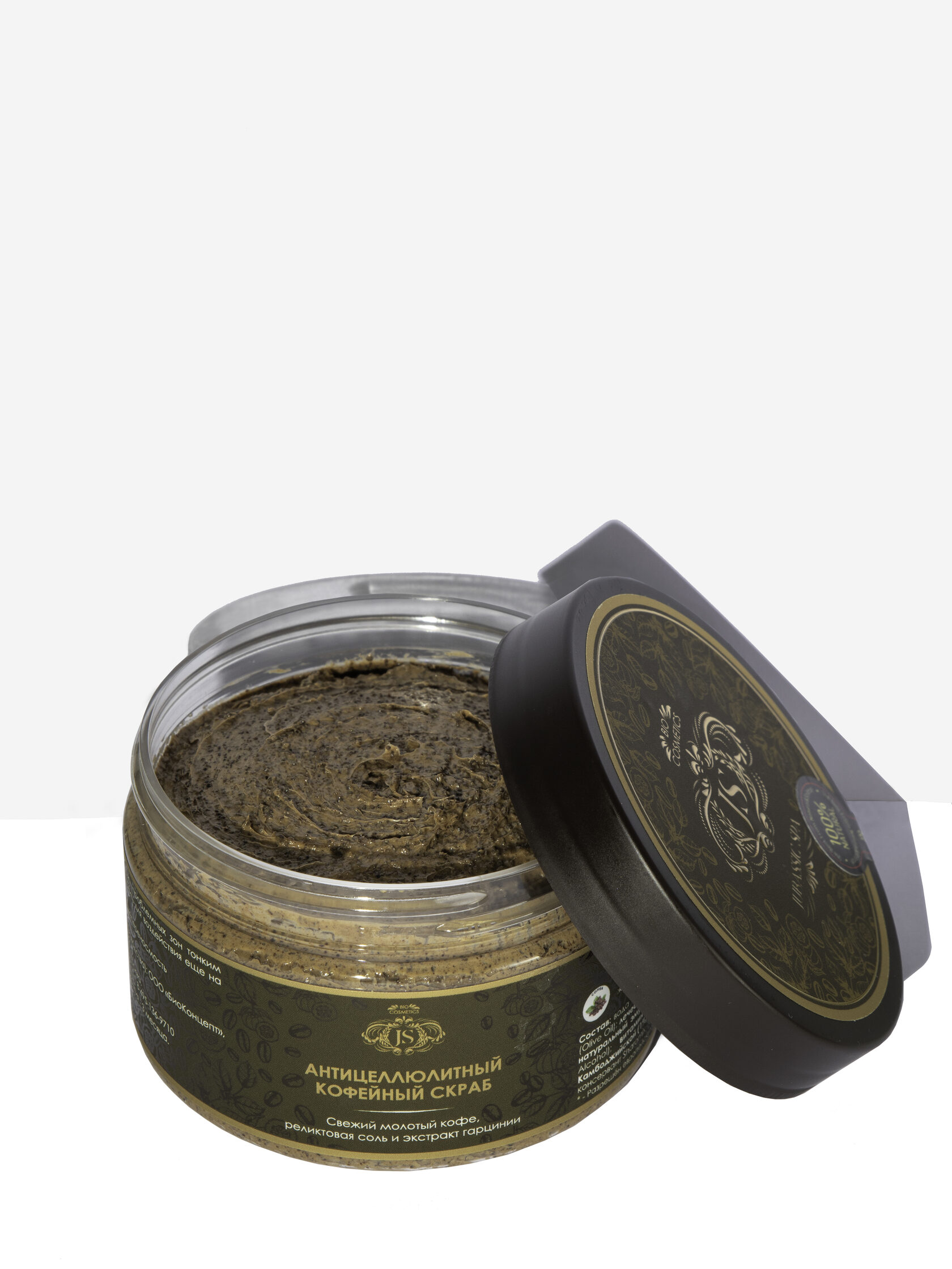 вода очищенная (Aqua); кофе молотый (20%) (Coffea (Coffee) Seed Powder); оливковое масло (Olea Europaea (Olive) Oil); лечебная реликтовая соль (Rapan Salt); кокосовое масло (Cocos Nucifera (Cocount) Oil); натуральный эмульгатор из пшеницы* (Cetearyl Wheat Straw Glycosides, Cetearyl Alcohol); витамин В3 (Niacinamide); кукурузное масло (Zea Mays Germ Oil); экстракт гарцинии камбоджийской (1%) (Garcinia Cambogia Extract); эфирное масло корицы (Cinnamon Essential Oil); органический консервант Sharomix 708* (Benzyl Alcohol, Benzoic Acid, Sorbic Acid, Glycerin).